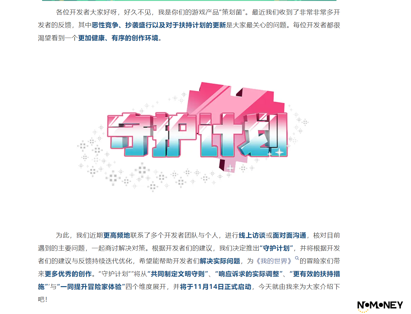 继《我的世界》中国版推出UGC2 0之后,上周官方又放出新动作-“守护计划”,顺势带出新的一系列UGC生态优化调整来对抗“限免价格战”、“抄