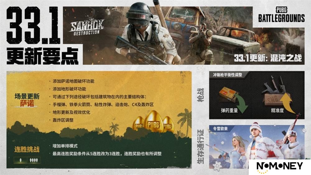 KRAFTON正式发布PUBG: BATTLEGROUNDS(以下简称PUBG) 33 1版本更新。为了给玩家提供更沉浸、更真实的游戏体验,萨诺地图现已升级为可破坏地图。此次更新引入了