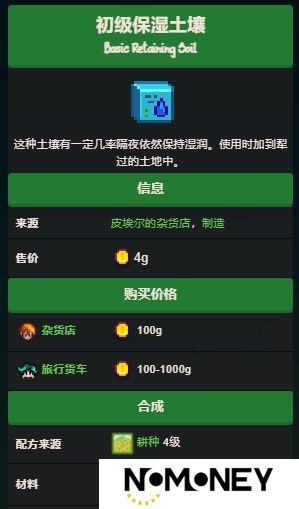 1、初级保湿土壤=是一种肥料,可以用来锁住土壤中的水分。玩家可以在皮埃尔的杂货店购买到,售价是100g或者自制。